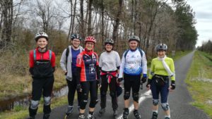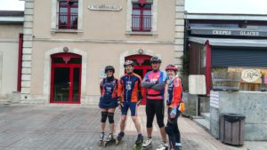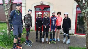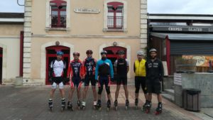 Les premiers à s’élancer sont bien sûr ceux qui veulent faire la boucle complète des 114,5km. Un groupe de 7 patineurs dont 3 extérieurs !! Yannick, Christophe et Alexandre ont relevé avec brio le défi de suivre Fabien, Pascal, Axel et Romain. Et presque tous ont fait la totalité des kilomètres, bien que certains GPS n’indiquent que 113,9 km en fin de journée!!